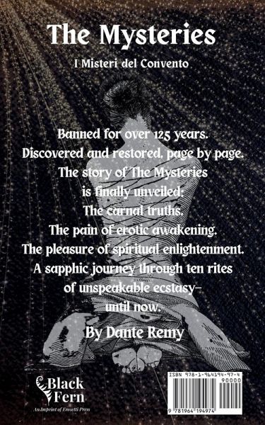 Unveil the Forbidden Secrets of "The Mysteries: I Misteri del Convento" Second Edition The Mysteries: I Misteri del Convento invites you into the shadowed halls of the Convento di Santa Voluttà, where faith and flesh entwine in an intoxicating union. This bold and provocative tale, restored and brought to life by Dante Remy, reveals a sapphic journey of erotic awakening and spiritual enlightenment-hidden for over 125 years and now unveiled for the first time. Deep within the remote Sicilian village of Monteconvento, Sister Lucille embarks on a journey through ten rites of unspeakable ecstasy. From the searing sting of the whip to the forbidden touch of erotic worship, each ritual challenges her to confront the boundaries of desire, power, and the divine. In this sacred yet scandalous space, every kiss is a prayer, and every moan a hymn, as Lucille discovers the carnal truths that lead to ultimate enlightenment. An Erotic Masterpiece of Restoration and Artistry Meticulously restored from the forbidden writings of Elisabeth Coote, Dante Remy had created a transformative reading experience where lust and sin become pathways to transcendence. The Mysteries is more than a story-it is an invitation to explore the delicate line between the sacred and the profane. This powerful narrative of spiritual and sexual awakening challenges conventions, ignites the senses, and dares readers to surrender to the forbidden pleasures within. Perfect for: Fans of gothic literature, erotic storytelling, and boundary-pushing narratives. If you appreciate tales that explore the profound connections between desire and spirituality, The Mysteries will captivate and enthrall you. Published by Black Fern, an imprint of Erosetti Press, The Mysteries transcends the erotic genre, offering a bold manifesto for those willing to lose themselves in the embrace of the forbidden. Prepare to be captivated-enlightenment awaits those who dare to surrender. Look inside the book at ErosettiPress.com!