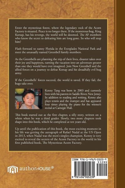Enter the mysterious forest, where the legendary rock of the Acorn Factory is situated. Peace is no longer there. If the monstrous bug, King Korsap, has his revenge, the world will be doomed. The AF members who know the secret to defeating him are long gone. So who will stop him? Flash forward to sunny Florida in the Everglades National Park and meet the unusually named Greenbell family members. As the Greenbells are planning the trip of their lives, disaster takes over their joy and happiness, turning the vacation into an adventure greater than one they would have ever imagined. Join Now Greenbell and the allied forces on a journey to defeat Korsap and his dreadfully evil bug army. If the Greenbells' forces succeed, the world is saved. If they fail, the bugs take over.