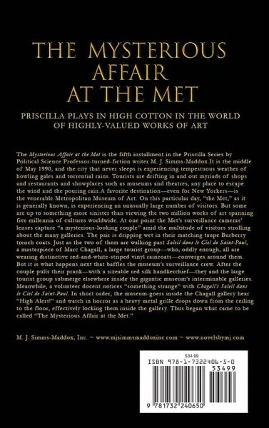 The Mysterious Affair at the Met: Priscilla Plays in High Cotton in the World of Highly-Valued Works of Art-the fifth installment in the Priscilla Series-begins in the middle of May 1990 in the city that never sleeps. Although New Yorkers are experiencing tempestuous weather of howling gales and torrential rains, still, people are out and about, dressed in rain hats and trench coats, and other waterproof wear. Tourists are drifting in and out myriads of shops and restaurants and showplaces such as museums and theatres, any place to escape the wind and the pouring rain. A favorite destination-even for New Yorkers-is the venerable Metropolitan Museum of Art. On this particular day, "the Met," as generally known, experiences an unusually large number of visitors. Visitors have their choice of viewing over two million works of art spanning five millennia of cultures worldwide. But some among them are up to something more sinister. At one point the Met surveillance cameras' lenses capture "a mysterious-looking couple" amid the many visitors strolling about the many galleries. The pair is dripping wet in their matching taupe Burberry trench coats. Just as the two of them walk past Soleil dans le Ciel de Saint-Paul, a masterpiece of Marc Chagall, a large tourist group-who, oddly enough, all are wearing distinctive red-and-white-striped vinyl raincoats-converges around them. But it is what happens next that baffles the museum's surveillance crew. After "the mysterious-looking couple" pulls off their prank, they and the large tourist group walk out of that particular camera's range, becoming submerged elsewhere in the interminable galleries of the gigantic museum. But when a docent notices "something strange" with Chagall's Soleil dans le Ciel de Saint-Paul, in short order, the museum-goers inside the Chagall gallery hear "High Alert!" and watch in horror as a heavy metal grille drops down from the ceiling to the floor, effectively locking them inside the gallery. And thus began what later came to be called "The Mysterious Affair at the Met." Meanwhile, Priscilla has returned home to Columbus, Ohio, from a secret mission as a special envoy in the Middle East. There are no terrorists on her tail. Nor does she sport her government-issued G45. Yet, the newlywed of nearly four months is unable to resume her marriage because her agent-husband Carlton has sustained a severe bout with amnesia. How he contracted the illness would puzzle her for some time to come. So Priscilla decides to open a branch public relations office in New York City because it is closer than Columbus to her in-laws in Bow Lake, New Hampshire, where her darling Carlton is recuperating. As word leaks about the "high alert"at the Met and about Priscilla is setting up shop in the City, the Met board of trustees acts quickly and retains the savvy and discreet PR consultant, P. J. Austin-Bernhardt. Determined to get to the bottom of the matter, Priscilla uses her intelligence-gathering prowess and delves head-on into circumstances surrounding the mysterious affair. She learns that a French artist named Thibaut Francois is at the heart of it all; he is a forger of masterpieces, a thief, and an extortionist, too. But Priscilla learns more. She learns that this global art fraud racket also involves one of Thibaut Francois's twin sons and a former associate who happens to be the current Met board chairman. The story takes off from here.