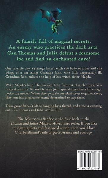 A family full of magical secrets. An enemy who practices the dark arts. Can Thomas and Julia defeat a fearsome foe and find an enchanted cure? ¿ One terrible day, a strange insect with the body of a bee and the wings of a bat stings Grandpa John, who falls desperately ill. Grandma Rini enlists the help of her witch sister Magda. With Magda's help, Thomas and Julia find out that the insect is a magical creature. To cure Grandpa John, special ingredients for a magic potion are needed. When they go to the mystical forest to gather them, they run into a fearsome enemy determined to stop them. Their grandfather's life is hanging by a thread, and time is running out. Can Thomas and Julia save his life? The Mysterious Bat-Bee is the first book in the Thomas and Julia's Magical Adventures series. If you like intriguing plots and fast-paced action, then you'll love C. S. Ferdinand's tale of perseverance and courage.