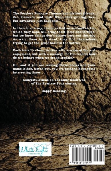The Fearless Four are Thomas and his best friends, Zac, Cameron and Josh. When they get together, fun adventure just happens! In their first story, the boys find an unusual bottle, which they hope will bring them fame and fortune, but we know things don’t always turn out the way we want them to. Instead, they find themselves trying to get the genie back in the bottle! Each book has been written with a sense of fun and enjoyment, but with a message for the reader; how do we behave when we are in trouble? Oh, and if you are reading these books and your name is Zac, watch out, you are going to have some interesting times. Congratulations on choosing Book One of The Fearless Four stories. Happy Reading.