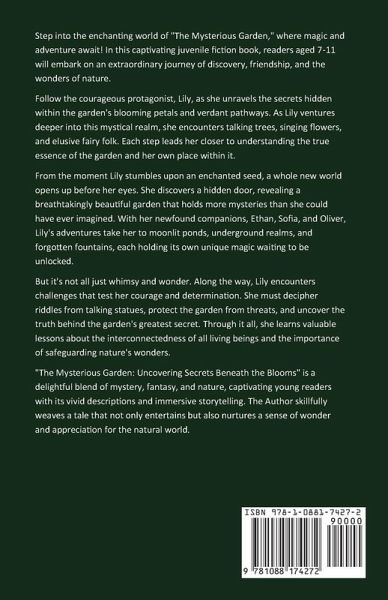 Step into the enchanting world of "The Mysterious Garden," where magic and adventure await! In this captivating juvenile fiction book, readers aged 7-11 will embark on an extraordinary journey of discovery, friendship, and the wonders of nature. Follow the courageous protagonist, Lily, as she unravels the secrets hidden within the garden's blooming petals and verdant pathways. As Lily ventures deeper into this mystical realm, she encounters talking trees, singing flowers, and elusive fairy folk. Each step leads her closer to understanding the true essence of the garden and her own place within it. From the moment Lily stumbles upon an enchanted seed, a whole new world opens up before her eyes. She discovers a hidden door, revealing a breathtakingly beautiful garden that holds more mysteries than she could have ever imagined. With her newfound companions, Ethan, Sofia, and Oliver, Lily's adventures take her to moonlit ponds, underground realms, and forgotten fountains, each holding its own unique magic waiting to be unlocked. But it's not all just whimsy and wonder. Along the way, Lily encounters challenges that test her courage and determination. She must decipher riddles from talking statues, protect the garden from threats, and uncover the truth behind the garden's greatest secret. Through it all, she learns valuable lessons about the interconnectedness of all living beings and the importance of safeguarding nature's wonders. "The Mysterious Garden: Uncovering Secrets Beneath the Blooms" is a delightful blend of mystery, fantasy, and nature, captivating young readers with its vivid descriptions and immersive storytelling. Author [Author Name] skillfully weaves a tale that not only entertains but also nurtures a sense of wonder and appreciation for the natural world. Perfect for children aged 7 to 11, this book will spark their imagination and ignite a love for adventure and the magic that can be found in everyday life. Join Lily and her friends on an unforgettable quest as they explore the garden's mysteries and forge lifelong friendships amidst its blooming wonders. Get ready to embark on an enchanting journey filled with secrets, friendship, and the boundless beauty of "The Mysterious Garden"!