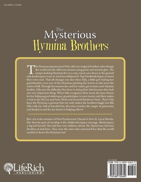 The Hymmas (pronounced Him-ahs) are magical brothers who change the world into the different seasons using paint and miracle glue. The unique looking Hymmas live in a cozy, warm cave down in the ground and don't want or need any "On Top Dwellers" to know they even exist. That all changes one day when Nila, a little girl visiting her grandmother, sees one of the Hymmas painting the leaves on the trees the colors of fall. Through the seasons she, and the reader, get to know each Hymma brother. Nila sees the difficulty they have in doing their jobs because they lack one very important thing. When Nila recognizes their need, she does chores for her "good ole' gram" to earn money and then makes a visit to the McCoy and Sons Thrift and General Hardware Store. There Nila buys the Hymmas a present that not only makes the brothers happy but fills Nila with joy. Full of fanciful fun, this story teaches the magic of generosity and kindness and the joy found in helping others!