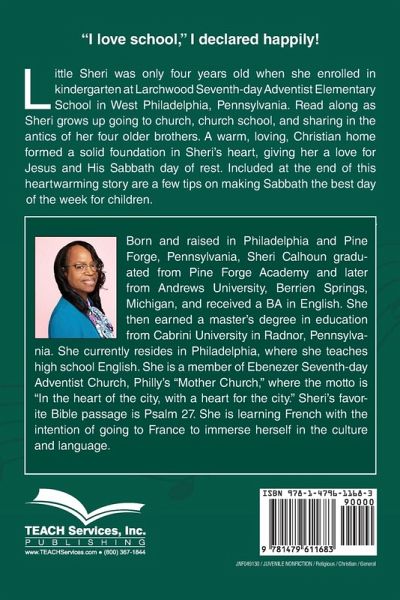 "I love school," I declared happily! Little Sheri was only four years old when she enrolled in kindergarten at Larchwood Seventh-day Adventist Elementary School in West Philadelphia, Pennsylvania. Read along as Sheri grows up going to church, church school, and sharing in the antics of her four older brothers. A warm, loving, Christian home formed a solid foundation in Sheri's heart, giving her a love for Jesus and His Sabbath day of rest. Included at the end of this heartwarming story are a few tips on making Sabbath the best day of the week for children.