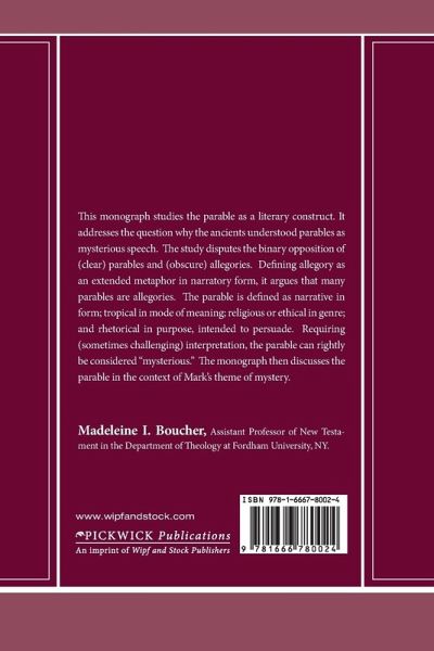 This monograph studies the parable as a literary construct. It addresses the question why the ancients understood parables as mysterious speech. The study disputes the binary opposition of (clear) parables and (obscure) allegories. Defining allegory as an extended metaphor in narratory form, it argues that many parables are allegories. The parable is defined as narrative in form; tropical in mode of meaning; religious or ethical in genre; and rhetorical in purpose, intended to persuade. Requiring (sometimes challenging) interpretation, the parable can rightly be considered "mysterious." The monograph then discusses the parable in the context of Mark's theme of mystery.