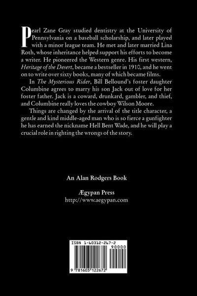 Pearl Zane Gray studied dentistry at the University of Pennsylvania on a baseball scholarship, and later played with a minor league team. He met and later married Lina Roth, whose inheritance helped support his efforts to become a writer. He pioneered the Western genre. His first western, Heritage of the Desert, became a bestseller in 1910, and he went on to write over sixty books, many of which became films. In The Mysterious Rider, Bill Bellound's foster daughter Columbine agrees to marry his son Jack out of love for her foster father. Jack is a coward, drunkard, gambler, and thief, and Columbine really loves the cowboy Wilson Moore.