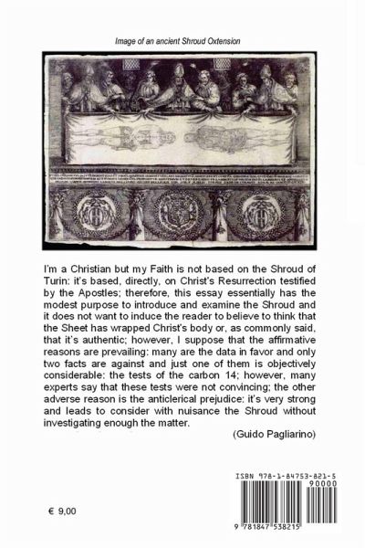 © 2000 www.pagliarino.com/sindone. The Author has the modest purpose to introduce and examine the Shroud and he does not want to induce the reader to believe to think that the Sheet has wrapped Christ's body or, as commonly said, that it's authentic; however, Pagliarino supposes that the affirmative reasons are prevailing: many are the data in favor and only two facts are against and just one of them is objectively considerable: the tests of the carbon 14; however, many experts say that these tests were not convincing; the other adverse reason is the anticlerical prejudice: it's very strong and leads to consider with nuisance the Shroud without investigating enough the matter.