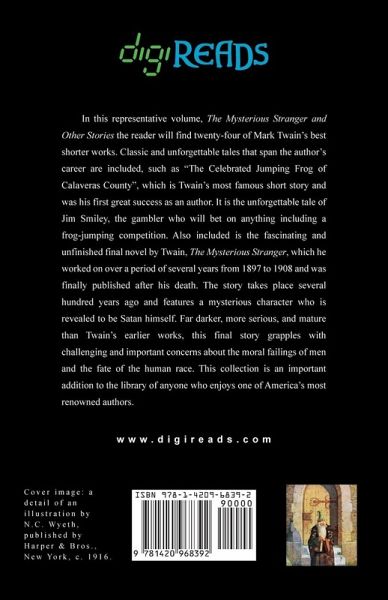 In this representative volume, "The Mysterious Stranger and Other Stories" the reader will find twenty-four of Mark Twain’s best shorter works. Classic and unforgettable tales that span the author’s career are included, such as "The Celebrated Jumping Frog of Calaveras County", which is Twain’s most famous short story and was his first great success as an author. It is the unforgettable tale of Jim Smiley, the gambler who will bet on anything including a frog-jumping competition. Also included is the fascinating and unfinished final novel by Twain, "The Mysterious Stranger", which he worked on over a period of several years from 1897 to 1908 and was finally published after his death. The story takes place several hundred years ago and features a mysterious character who is revealed to be Satan himself. Far darker, more serious, and mature than Twain’s earlier works, this final story grapples with challenging and important concerns about the moral failings of men and the fate of the human race. This collection is an important addition to the library of anyone who enjoys one of America’s most renowned authors. This edition is printed on premium acid-free paper.
