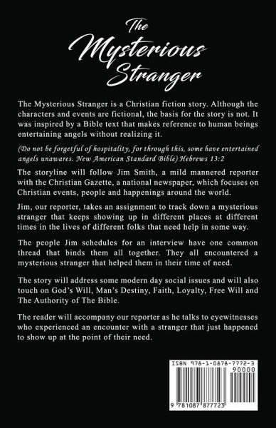 The Mysterious Stranger is a Christian fiction story. The characters are not real to life but the subject matter is. The storyline follows a reporter for a National Christian Newspaper that is assigned the task of tracking down a, "Mysterious Stranger" that appeared in the lives of several ordinary folks at a time when they were calling out to God for help or otherwise in peril. The book is focused around human beings entertaining angels unawares. It is inspired by a Biblical reference to angelic encounters found in Hebrews 13:2 "Do not be forgetful of hospitality, for through this, some have entertained angels unawares." New American Standard Bible) Our reporter will interview a bus driver, a waitress, a truck driver, a wilderness adventure guide, a war hero, a family member and other persons of interest in an attempt to profile the mystery man. During the search for the Mysterious Stranger, our reporter will be educated as to the origin of angels, their mission; their gender; their power; their destiny; and other aspects of the angelic helm according to Biblical references.