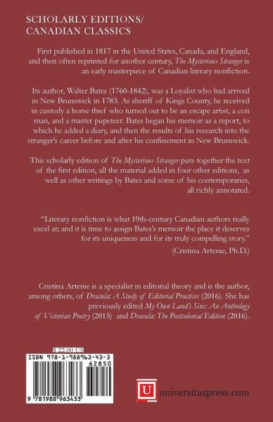 True crime non-fiction first published in 1817 about a famous confidence man who eluded law enforcement in both Canada and the United States. Walter Bates was the one who captured this notorious criminal when he was sheriff of King's County, New Brunswick. Bates conducted interviews with the man who escaped from custody on more than one occasion and with eye witnesses. His memoir, at the time a best selling account, occupies a special place in Canadian writing. This is a unique scholarly edition that includes, besides the original text, a treasure trove of contextual material that will help readers enjoy more fully this little-known classic of Canadian non-fiction, including letters, newspaper articles, notes and other, later, texts by Bates. The research is new and comprehensive for a Canadian work two hundred years old.