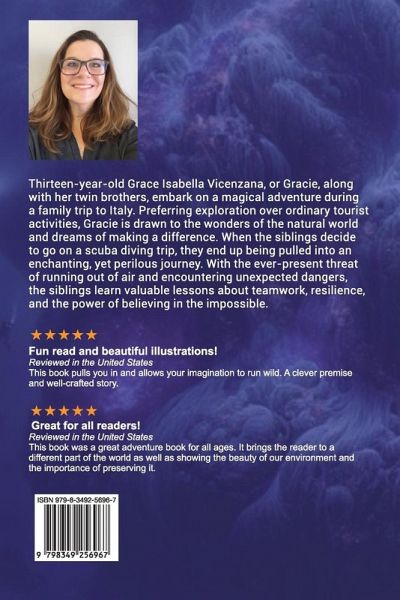 Thirteen-year-old Grace Isabella Vicenzana, or Gracie, is no ordinary tourist. While visiting Italy with her family, she craves adventure beyond museums and landmarks. When she and her twin brothers set off on a scuba diving trip, they stumble upon a mysterious underwater world, one filled with hidden wonders, ancient secrets, and unexpected dangers. As they dive deeper, the siblings must rely on teamwork, resilience, and courage to navigate a journey where the magic of the ocean is as breathtaking as it is perilous. With their air supply running low and the unknown lurking in the depths, they soon realize this is more than just an adventure-it's a test of their strength, their bond, and their belief in the impossible. Perfect for fans of thrilling discoveries, sibling teamwork, and the magic of the deep!