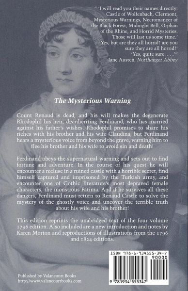 The good old Count Renaud is dead, and his will makes the degenerate Rhodophil his heir, disinheriting his other son Ferdinand, who has married against his father's wishes. Rhodophil promises to share his new riches with his younger brother and his wife Claudina, but Ferdinand hears a mysterious voice from beyond the grave, warning him to flee his brother and his wife to save himself from sin and death! Ferdinand obeys the supernatural warning and sets out to find fortune and adventure. In the course of his quest he will encounter a recluse in a ruined castle with a horrible secret, find himself captured and imprisoned by the Turkish army, and encounter one of Gothic literature's most depraved female characters, the monstrous Fatima. And if he survives all these dangers, Ferdinand must return to Renaud Castle to solve the mystery of the ghostly voice and uncover the terrible truth about his wife and his brother! This edition includes the unabridged text of the four volume 1796 edition, with a new introduction and notes by Karen Morton, and reproductions of illustrations from the 1796 and 1824 editions.