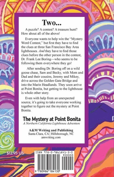 A puzzle? A contest? A treasure hunt? How about all of the above! Everyone wants to help win the "Mystery Word Contest," but first they have to find the clues at three San Francisco Bay Area lighthouses. And they have to find those clues before the other person in the contest, Dr. Frank Lee Boring-who seems to be following them everywhere they go! After sending Dr. Boring off on a wild goose chase, Sam and Becky, with Mom and Dad and their cousins, Jeremy and Mikey, drive across the Golden Gate Bridge and into the Marin Headlands. They soon arrive at Point Bonita, but getting to the lighthouse is whole other story. Even with help from an unexpected source, it's going to take everyone working together to figure out the mystery at Point Bonita.