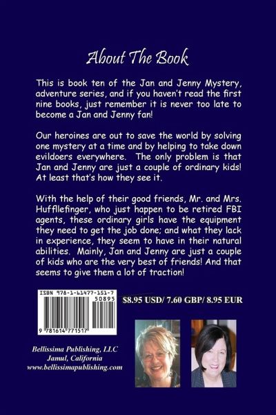 Once again best friends, Jan and Jenny are off another big adventure, although this time they didn't have to do the dangerous part all alone. Convinced by Jan to become a candy striper volunteer at the local hospital for the summer, Jenny not only goes along with the idea, she embraces it! Find out what the girls fall into this time and how Mr. Hufflefinger saves the day and how they save Mr. Hufflefinger's life with their quick thinking and fast action. What is the gruesome discovery the purple lady volunteer, Anne, has found going on in the hospital? And how do Jan and Jenny fit into the FBI's plan to uproot a band of evildoers. Written by twenty year veteran court reporter, Pamela Hillan, and award winning author, attorney and former teacher, Penelope Dyan, this book is another Jan and Jenny book that is sure to capture your interest as it relates yet another tale to you that is filled with twists and turns. Like Jan and Jenny, our co-authors have been life-long friends, and they intend to continue to be so; because like our heroines, Jan and Jenny, our authors know the true meaning of friendship and loyalty and those are two very important concepts everyone needs to learn and practice. You see, when we work together for a common cause, like Jan and Jenny, anything can happen! You might even save the world!