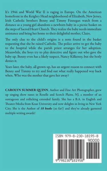 It's 1944 and World War II is raging in Europe. On the American homefront in the Keighry Head neighborhood of Elizabeth, New Jersey, Irish Catholic brothers Benny and Timmy Finnegan watch from a distance as a young girl abandons a newborn baby in a picnic basket on the steps of Sacred Heart Church. They realize the baby needs immediate assistance and bring her home to their delightful mother, Claire. The only clue to the child's origins is a note found in the basket requesting that the child be raised Catholic. The police arrive to get the baby to the hospital while the parish priest arranges for her adoption. Meanwhile, the boys try to play detective to figure out who gave the baby up, and even have a likely suspect, Nancy Kilkenny, but she hotly denies it. Years later, the baby, all grown up, has an urgent reason to connect with Benny and Timmy to try and find out what really happened way back when. Who was the mother who gave her away? What happened on that memorable day in 1944? And can she ever manage to find out the truth?