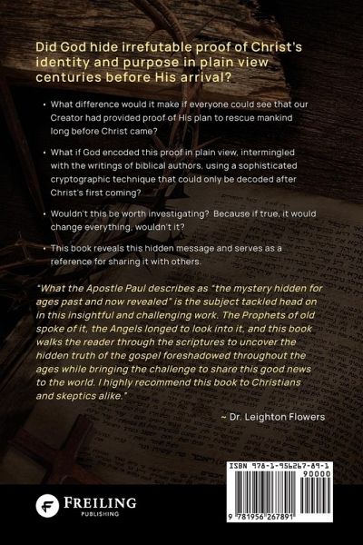 Did God hide irrefutable proof of Christ's identity and purpose in plain view centuries before His arrival? ¿ What difference would it make if everyone could see that our Creator had provided proof of His plan to rescue mankind long before Christ came? ¿ What if God encoded this proof in plain view, intermingled with the writings of biblical authors, using a sophisticated cryptographic technique that could only be decoded after Christ's first coming? ¿ Wouldn't this be worth investigating? Because if true, it would change everything, wouldn't it? ¿ This book reveals this hidden message and serves as a reference for sharing it with others.