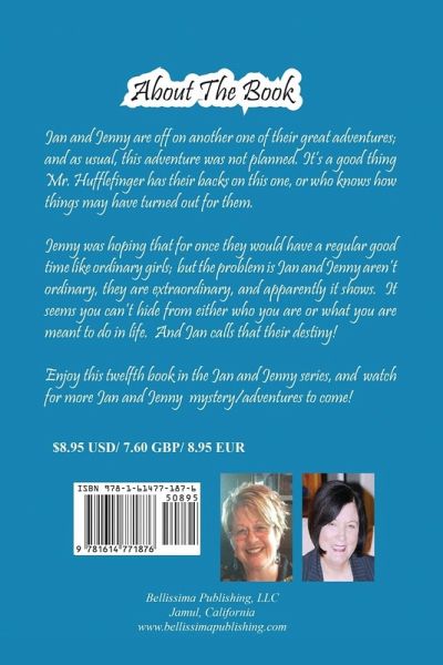 Jan and Jenny are off on yet another adventure in this twelfth book of the "Jan and Jenny Series." This mystery/adventure is the most exciting and frightening of all their adventures to date, because our two sleuths uncover something that is about to happen that has the potential to turn the entire world into a state of chaos! Jan and Jenny work with retired FBI agent, Mr. Hufflefinger, once again, and in the end the two of them are successful (as usual) and have a huge honor bestowed on them, at laest it seems like that to them. Jenny is her usual grumbling self as Jan jumps into danger with both feet and without a second thought, but they stick together though it all, because this is what it means to be best friends. Written by award winning author, attorney and former teacher, Penelope Dyan and twenty year veteran court reporter, Pamela Hillan, it is no wonder the subjects of these books are so relevant and accurate as Jan and Jenny save the world! And in this book they do a very good job of that!