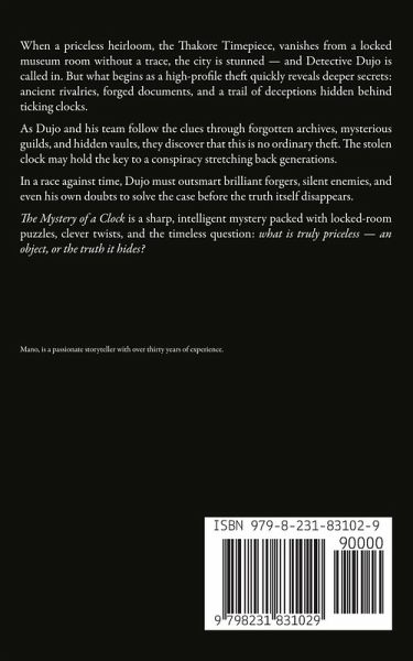 When a priceless heirloom, the Thakore Timepiece, vanishes from a locked museum room without a trace, the city is stunned - and Detective Dujo is called in. But what begins as a high-profile theft quickly reveals deeper secrets: ancient rivalries, forged documents, and a trail of deceptions hidden behind ticking clocks. As Dujo and his team follow the clues through forgotten archives, mysterious guilds, and hidden vaults, they discover that this is no ordinary theft. The stolen clock may hold the key to a conspiracy stretching back generations. In a race against time, Dujo must outsmart brilliant forgers, silent enemies, and even his own doubts to solve the case before the truth itself disappears. The Mystery of a Clock is a sharp, intelligent mystery packed with locked-room puzzles, clever twists, and the timeless question: what is truly priceless - an object, or the truth it hides?