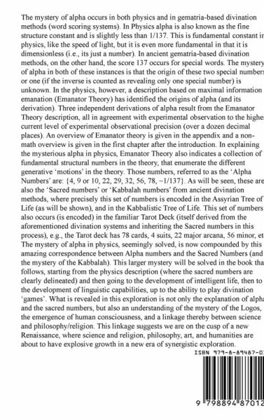The mystery of alpha occurs in both physics and in gematria-based divination methods (word scoring systems). In Physics alpha is also known as the fine structure constant and is slightly less than 1/137. This is fundamental constant in physics, like the speed of light, but it is even more fundamental in that it is dimensionless (i.e., it's just a number). In ancient gematria-based divination methods, on the other hand, the score 137 occurs for special words. The mystery of alpha in both of these instances is that the origin of these two special numbers, or one (if the inverse is counted as revealing only one special number) is unknown. The mysterious alpha is explained in Emanator Theory, where it also indicates a collection of fundamental structural numbers in the theory that enumerate the different generative 'motions'. These numbers, referred to as the 'Alpha Numbers' are: {4, 9 or 10, 22, 29, 32, 56, 78, 1/137}. As will be seen, these are also the 'Sacred numbers' or 'Kabbalah numbers' from ancient divination methods, where precisely this set of numbers is encoded in the Assyrian Tree of Life (as will be shown), and in the Kabbalistic Tree of Life. This set of numbers also occurs (is encoded) in the familiar Tarot Deck. The mystery of alpha in physics, seemingly solved, reveals an amazing correspondence between the Alpha numbers and the Sacred Numbers (and the mystery of the Kabbalah). This larger mystery will be solved in the book that follows, starting from the physics description, then going to the development of intelligent life, then to the development of linguistic capabilities, up to the ability to play divination 'games'. What is revealed in this exploration is not only the explanation of alpha and the sacred numbers, but also an understanding of the mystery of the Logos, the emergence of human consciousness, and a linkage thereby between science and philosophy/religion. This linkage suggests we are on the cusp of a new Renaissance, where science, religion, philosophy, art, and humanities are about to have explosive growth in a new era of synergistic exploration.
