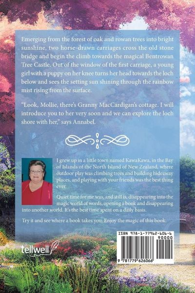 Emerging from the forest of oak and rowan trees into bright sunshine, two horse-drawn carriages cross the old stone bridge and begin the climb towards the magical Bentrowan Tree Castle. Out of the window of the first carriage, a young girl with a puppy on her knee turns her head towards the loch below and sees the setting sun shining through the rainbow mist rising from the surface. "Look, Mollie, there's Granny MacCardigan's cottage. I will introduce you to her very soon and we can explore the loch shore with her," says Annabel.