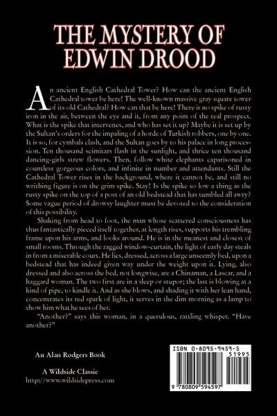 Through the ragged window-curtain, the light of early day steals in from a miserable court. He lies, dressed, across a large unseemly bed, upon a bedstead that has indeed given way under the weight upon it. Lying, also dressed and also across the bed, not longwise, are a Chinaman, a Lascar, and a haggard woman. The two first are in a sleep or stupor; the last is blowing at a kind of pipe, to kindle it. And as she blows, and shading it with her lean hand, concentrates its red spark of light, it serves in the dim morning as a lamp to show him what he sees of her. "Another?" says this woman, in a querulous, rattling whisper. "Have another?"