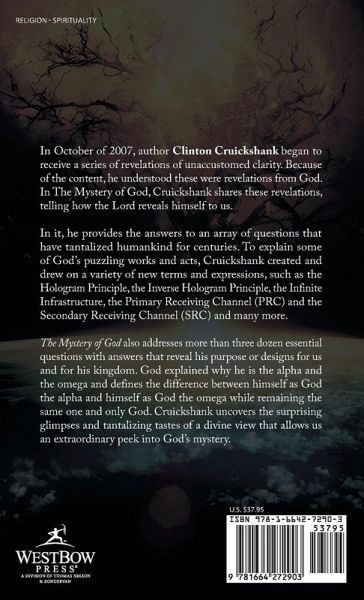 In October of 2007, author Clinton Cruickshank began to receive a series of revelations of unaccustomed clarity. Because of the content, he understood these were revelations from God. In The Mystery of God, Cruickshank shares these revelations, telling how the Lord reveals himself to us. In it, he provides the answers to an array of questions that have tantalized humankind for centuries. To explain some of God's puzzling works and acts, Cruickshank created and drew on a variety of new terms and expressions, such as the Hologram Principle, the Inverse Hologram Principle, the Infinite Infrastructure, the Primary Receiving Channel (PRC) and the Secondary Receiving Channel (SRC) and many more. The Mystery of God also addresses more than three dozen essential questions with answers that reveal his purpose or designs for us and for his kingdom. God explained why he is the alpha and the omega and defines the difference between himself as God the alpha and himself as God the omega while remaining the same one and only God. Cruickshank uncovers the surprising glimpses and tantalizing tastes of a divine view that allows us an extraordinary peek into God's mystery.