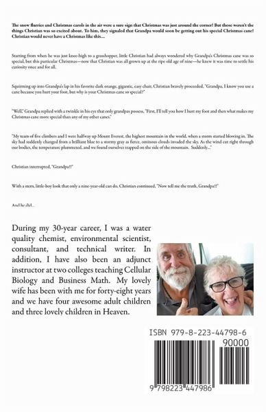 The snow flurries and Christmas carols in the air were a sure sign that Christmas was just around the corner! But those weren't the things Christian was so excited about. To him, they signaled that Grandpa would soon be getting out his special Christmas cane! Christian would never have a Christmas like this… Starting from when he was just knee-high to a grasshopper, little Christian had always wondered why Grandpa's Christmas cane was so special, but this particular Christmas-now that Christian was all grown up at the ripe old age of nine-he knew it was time to settle his curiosity once and for all. Squirming up into Grandpa's lap in his favorite dark orange, gigantic, easy chair, Christian bravely proceeded, "Grandpa, I know you use a cane because you hurt your foot, but why is your Christmas cane so special?" "Well," Grandpa replied with a twinkle in his eye that only grandpas possess, "First, I'll tell you how I hurt my foot and then what makes my Christmas cane more special than any of my other canes." "My team of five climbers and I were halfway up Mount Everest, the highest mountain in the world, when a storm started blowing in. The sky had suddenly changed from a brilliant blue to a stormy gray as fierce, ominous clouds invaded the sky. As the wind cut right through our bodies, the temperature plummeted, and we found ourselves trapped on the side of the mountain. Suddenly…" Christian interrupted, "Grandpa!!" With a stern, little-boy look that only a nine-year-old can do, Christian continued, "Now tell me the truth, Grandpa!!" Looking down at little Christian with a grin, the old man had been caught! Christian now sat in rapt attention and delight as Grandpa unfolded the true mystery of his Christmas cane.