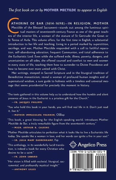 Catherine de Bar (1614-1698)-in religion, Mother Mectilde of the Blessed Sacrament-stands out among the luminous spiritual masters of seventeenth-century France as one of the great teachers of the interior life, a woman of the stature of St Gertrude the Great or St Teresa of Avila. Living in a period marked by superstition, sacrilege, and war, Mother Mectilde responded with a call to faithful reparation, self-abandoning adoration, frequent Communion, and total adherence to the Eucharistic Lord. Even while she suffered exile, illness, poverty, dangers, and uncertainties on all sides, she offered counsel and comfort to men and women in every state of life, teaching them how to surrender to Divine Providence and how to become ever more united with Christ.