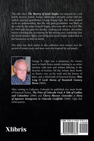 The title story, The Mystery of Jacob Engles, was inspired by a real family mystery. Family history information abruptly ended with the author's paternal grandfather, George Ewing Ogle. But there seemed to be an understanding that the real great-grandfather was likely to be a man by the name of Jacob Engles, who went off to the Civil War in 1864 and was gone for decades. Lacking real answers, the author weaves a moving tale, accounting for the missing years, explaining how the family became Ogles, and telling how Jacob Engles ended back in the hometown to find his family. The other ten short stories in this collection were written over the period of sixteen years, and most were also inspired by real people.