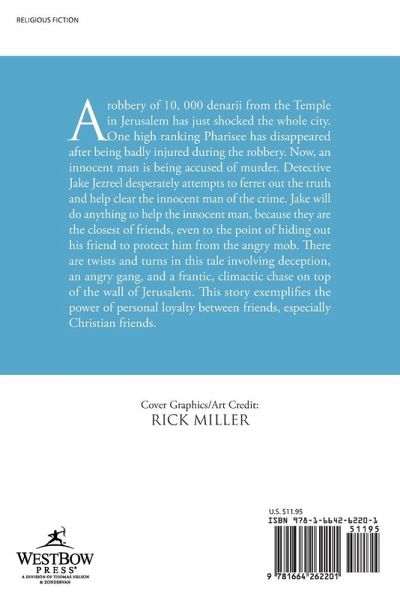 A robbery of 10, 000 denarii from the Temple in Jerusalem has just shocked the whole city. One high ranking Pharisee has disappeared after being badly injured during the robbery. Now, an innocent man is being accused of murder. Detective Jake Jezreel desperately attempts to ferret out the truth and help clear the innocent man of the crime. Jake will do anything to help the innocent man, because they are the closest of friends, even to the point of hiding out his friend to protect him from the angry mob. There are twists and turns in this tale involving deception, an angry gang, and a frantic, climactic chase on top of the wall of Jerusalem. This story exemplifies the power of personal loyalty between friends, especially Christian friends.