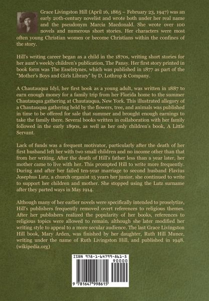 Grace Livingston Hill (April 16, 1865 - February 23, 1947) was an early 20th-century novelist and wrote both under her real name and the pseudonym Marcia Macdonald. She wrote over 100 novels and numerous short stories. Her characters were most often young Christian women or become Christians within the confines of the story. Hill's writing career began as a child in the 1870s, writing short stories for her aunt's weekly children's publication, The Pansy. Her first story printed in book form was The Esselstynes, which was published in 1877 as part of the "Mother's Boys and Girls Library" by D.…mehr