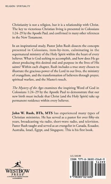 Christianity is not a religion, but it is a relationship with Christ. The key to victorious Christian living is presented in Colossians 1:24-29 by the Apostle Paul, and confirmed in many other references in the New Testament. In an inspirational study, Pastor John Rush dissects the concepts presented in Colossians, item-by-item, culminating in the supernatural ministry of the Holy Spirit within the heart of every believer. What is God seeking to accomplish, and how does He go about producing this desired end and purpose in the lives of His saints? Within each chapter, Rush includes a true story chosen to illustrate the gracious power of the Lord in our lives, the ministry of evangelism, and the transformation of believers through prayer, spiritual warfare, and the Master's touch. The Mystery of the Ages examines the inspiring Word of God in Colossians 1:24-29 by the Apostle Paul to demonstrate that our new birth must include that Christ (and the Holy Spirit) take up permanent residence within every believer.