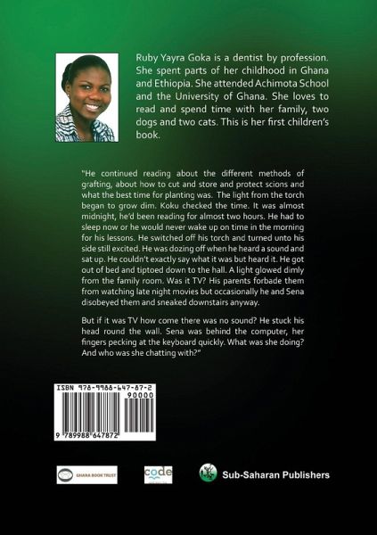 This book was awarded a Burt Award for African Literature, Ghana 2010. The Burt Award for African Literature is a new literary prize that the recognizes excellence in young adult fiction from Africa. He continued reading about the different methods of grafting, about how to cut and store and protect scions and what the best time for planting was. The light from the torch began to grow dim. Koku checked the time. It was almost midnight, he had been reading for almost two hours. He had to sleep now or he would never wake up on time in the morning for his lessons. He switched off his torch and turned unto his side still excited. He was dozing off when he heard a sound and sat up. He couldn't exactly say what it was but heard it. He got out of bed and tiptoed down to the hall. A light glowed dimly from the family room. Was it TV? His parents forbade them from watching late night movies but occasionally he and Sena disobeyed them and sneaked downstairs anyway. But if it was TV how come there was no sound? He stuck his head round the wall. Sena was behind the computer, her fingers pecking at the keyboard quickly. What was she doing? And who was she chatting with?