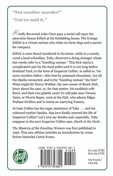"Not another murder!" "You've said it." Kindly Reverend John Clare pays a social call upon the saturnine Simon Killick at his forbidding house, The Grange. Killick is a virtual recluse who relies on three dogs and a parrot for company. Killick is soon found murdered in his home, while in a nearby wood a local schoolboy, Toby, discovers a dying stranger whose last words refer to a "kneeling woman." This kick-starts a complicated case for the local police and it is not long before Scotland Yard, in the form of Inspector Collier, is called in. Yet more murders follow-this time by poisoned chocolates. Are all the deaths connected, and is the "kneeling woman" the link? What might Sir Henry Webber, the new owner of Brock Hall, know about the case, or, for that matter, his snobbish wife Beryl, and their two ghastly sons? Or odd jobs man Tommy Yates, or Florrie Soper, cook at the Hall, who adores Edgar Wallace thrillers and is intent on marrying Tommy. At least Collier has the eager assistance of Toby . . . and his widowed mother Sandra. Has love finally entered the life of Inspector Collier? Let's just say Sandra and, especially, Toby reappear in the next Inspector Collier case, Death in the Dark. The Mystery of the Kneeling Woman was first published in 1936. This new edition includes an introduction by crime fiction historian Curtis Evans.