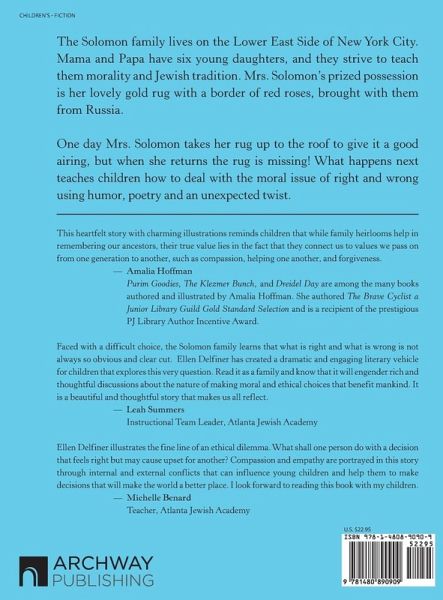 The Solomon family lives on the Lower East Side of New York City. Mama and Papa have six young daughters, and they strive to teach them morality and Jewish tradition. Mrs. Solomon's prized possession is her lovely gold rug with a border of red roses, brought with them from Russia. One day Mrs. Solomon takes her rug up to the roof to give it a good airing, but when she returns the rug is missing! What happens next teaches children how to deal with the moral issue of right and wrong using humor, poetry and an unexpected twist.