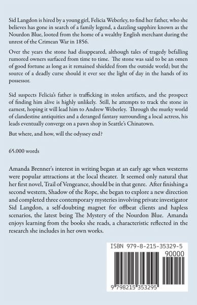 Sid Langdon is hired by a young girl, Felicia Weberley, to find her father, who she believes has gone in search of a family legend, a dazzling sapphire known as the Nourdon Blue, looted from the home of a wealthy English merchant during the unrest of the Crimean War in 1856. Over the years the stone had disappeared, although tales of tragedy befalling rumored owners surfaced from time to time. The stone was said to be an omen of good fortune as long as it remained shielded from the outside world; but the source of a deadly curse should it ever see the light of day in the hands of its possessor. Sid suspects Felicia's father is trafficking in stolen artifacts, and the prospect of finding him alive is highly unlikely. Still, he attempts to track the stone in earnest, hoping it will lead him to Andrew Weberley. Through the murky world of clandestine antiquities and a deranged fantasy surrounding a local actress, his leads eventually converge on a pawn shop in Seattle's Chinatown. But where, and how, will the odyssey end? 65,000 words