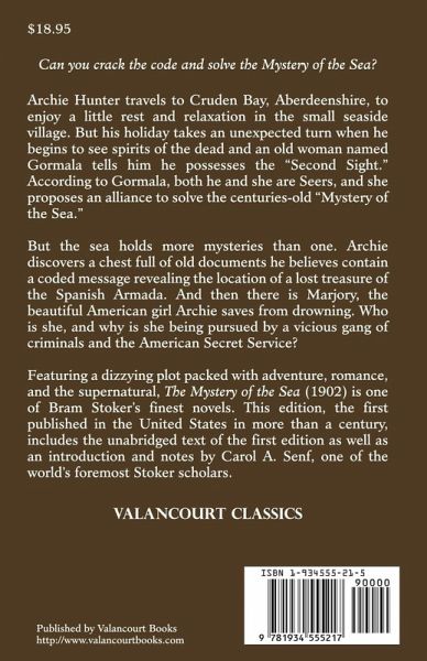 Can you crack the code and solve the Mystery of the Sea? Archie Hunter travels to Cruden Bay, Aberdeenshire, to enjoy a little rest and relaxation in the small seaside village. But his holiday takes an unexpected turn when he begins to see spirits of the dead and an old woman named Gormala tells him he possesses the "Second Sight." According to Gormala, both he and she are Seers, and she proposes an alliance to solve the centuries-old "Mystery of the Sea." But the sea holds more mysteries than one. Archie discovers a chest full of old documents he believes contain a coded message revealing the location of a lost treasure of the Spanish Armada. And then there is Marjory, the beautiful American girl Archie saves from drowning. Who is she, and why is she being pursued by a vicious gang of criminals and the American Secret Service? Featuring a dizzying plot packed with adventure, romance, and the supernatural, The Mystery of the Sea (1902) is one of Bram Stoker's finest novels. This edition, the first published in the United States in more than a century, features the unabridged text of the first edition as well as an introduction and notes by Carol A. Senf, one of the world's foremost Stoker scholars.