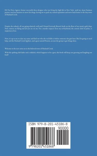 Hi! I'm Dove Agnew, former successful dress designer who was living the high life in New York, until my sleazy business partner used my business to move his drugs, leaving me to pack my ruined reputation and move back home to the tiny town of Harland Creek. Despite the setback, all was going relatively well until I found Gertrude Brown's body on the floor of my mom's quilt shop. Now, rumors are flying and all eyes are on me. I'm a murder suspect! Even my ex-boyfriend, the current chief of police, is suspicious of me. Now, it's up to me to clear my name and find out who the real killer is before someone else gets hurt. But I'm going to need help, and the Harland Creek Quilters, and a goat named Petunia, are just the group to get things done. Welcome to the new series set in the beloved town of Harland Creek. With the quilting club ladies and a sidekick, which happens to be a goat, this book will keep you guessing and laughing out loud!