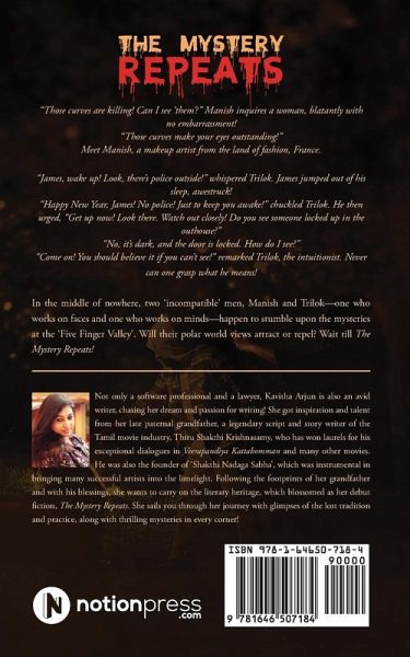 "Those curves are killing! Can I see 'them'?" Manish inquires a woman, blatantly with no embarrassment! "Those curves make your eyes outstanding!" Meet Manish, a makeup artist from the land of fashion, France. "James, wake up! Look, there's police outside!" whispered Trilok. James jumped out of his sleep, awestruck! "Happy New Year, James! No police! Just to keep you awake!" chuckled Trilok. He then urged, "Get up now! Look there. Watch out closely! Do you see someone locked up in the outhouse?" "No, it's dark, and the door is locked. How do I see?" "Come on! You should believe it if you can't see!" remarked Trilok, the intuitionist. Never can one grasp what he means! In the middle of nowhere, two 'incompatible' men, Manish and Trilok--one who works on faces and one who works on minds--happen to stumble upon the mysteries at the 'Five Finger Valley'. Will their polar world views attract or repel? Wait till The Mystery Repeats!