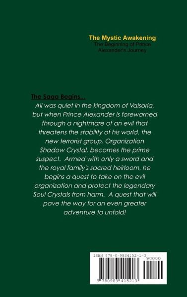 In the first book of an epic series, Prince Alexander of Valsoria sets out from home to take on the evil organization known as Organization Shadow Crystal who threaten to destroy and take over his kingdom with the use of strange new weapons. If that weren't bad enough, he receives a nightmare of an ominous shadow that threatens the safety of the legendary Soul Crystals of his world. What adventures await Prince Alex? Where will his path take him? What friends and enemies will he meet along the way? Find out in this 41 chapter story of action, adventure, and fantasy that is sure to capture your heart and imagination! Recommended for ages 13+