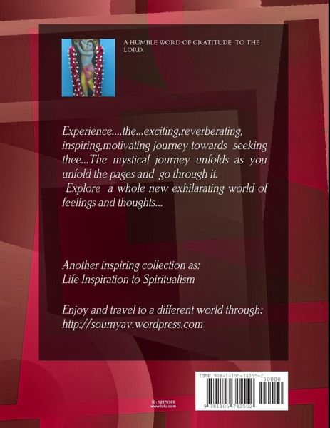 Collection of poems which will take you through a mystical journey of faith,patience,contentment in seeking god.An inspiring book for all who are constantly under stress,tensions and over bogged by work. A rejuvenating book that will reimbibe the enthusiasm of life with experience of bliss while you travel on this path of the mystique.The continous journey of evolving and dwelling deep within ourselves in pursuit of happiness.