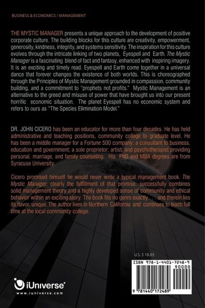 The Mystic Manager is a vision for the future and a counterbalance to the disturbing economic times we face - times brought about by greed and misuse of corporate power. The book is personal and a contribution placed into the collective unconscious to do what good it can. Mystic Management is a unique approach to the development of positive corporate culture. The building blocks for this culture are creativity, empowerment, generosity, kindness, integrity, and diversity. The inspiration for this culture evolves through the cosmic linking of two planets, the Planet Eyespell and the Planet Earth. The author promised himself he would never write a typical management textbook. The Mystic Manager is the fulfillment of that promise combining solid management theory with a highly developed sense of community and ethical behavior bound in a fantasy/sci-fi environment. The book fits no genre exactly. It's not fiction, but certainly not non-fiction . . . and therein lies its flavor, unique.