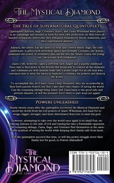 The Mystical Diamond: The Complete Collection The Mystical Diamond The Tale of Supernatural Quintuplets Quintuplets Astraea, Sage, Cristiano, Alaric, and Zaina Whiteman were placed in an orphanage and divided at birth for their own protection. As their lives all headed in separate directions, they remained bounded by blood, memories, and their supernatural abilities. Astraea, the oldest, has the ability to read and control minds. Sage, the compassionate, is gifted with incredible speed and strength. Cristiano, the wisest, possesses the power of invisibility and can see into the future. Zaina, the youngest, can levitate with telekinesis. Alaric's life, however, takes a different turn. Anger and a painful childhood force him to find peace in the woods. But being able to control all the elements and communicate with animals make him a prime target for an old man who convinces him to steal the mystical diamond to enhance his powers and destroy the world. To accomplish this, he'll need Zaina's help. Reunited, they are as powerful as their birth parents feared, but that's also their only chance of saving the world. Can the remaining siblings bring Alaric and Zaina back to the good side and prevent disaster, or will the pressure force them to part ways yet again? Powers Unleashed Nearly twenty years after the quintuplets recovered the Mystical Diamond and saved the world from the evil powers of Alaric Whiteman, he's back for revenge, bigger, stronger, and more determined than ever to meet his goal. However, attempting to take over the world once again is no small feat, entrancing Astraea to the side of evil and turning her into a formidable opponent. The remaining siblings, Zaina, Sage, and Cristiano find themselves in the unenviable position of saving the world while keeping their family safe from harm. Will the quintuplets succeed this time, or will this power struggle sever their family ties for good, in Powers Unleashed?