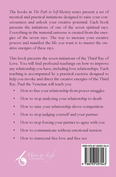 The books in The Path to Self-Mastery series present a set of mystical and practical initiations designed to raise your consciousness and unlock your creative potential. Each book presents the initiations of one of the seven spiritual rays. Everything in the material universe is created from the energies of the seven rays. The way to increase your creative powers and manifest the life you want is to master the creative energies of these rays. This book presents the seven initiations of the Third Ray of Love. You will find profound teachings on how to improve any relationship you have, including love relationships. Each teaching is accompanied by a practical exercise designed to help you invoke and direct the creative energies of the Third Ray. Paul the Venetian will teach you: How to free your relationship from power struggles How to stop analyzing your relationship to death How to raise your relationship above competition How to stop judging yourself and your partner How to stop forcing your partner to agree with you How to communicate without emotional tension How to transcend free love and free sex
