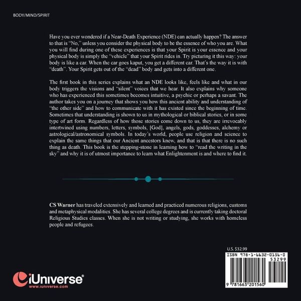 Have you ever wondered if a Near-Death Experience (NDE) can actually happen? The answer to that is "No," unless you consider the physical body to be the essence of who you are. What you will find during one of these experiences is that your Spirit is your essence and your physical body is simply the "vehicle" that your Spirit rides in. Try picturing it this way: your body is like a car. When the car goes kaput, you get a different car. That's the way it is with "death". Your Spirit gets out of the "dead" body and gets into a different one. The first book in this series explains what an NDE looks like, feels like and what in our body triggers the visions and "silent" voices that we hear. It also explains why someone who has experienced this sometimes becomes intuitive, a psychic or perhaps a savant. The author takes you on a journey that shows you how this ancient ability and understanding of "the other side" and how to communicate with it has existed since the beginning of time. Sometimes that understanding is shown to us in mythological or biblical stories, or in some type of art form. Regardless of how those stories come down to us, they are irrevocably intertwined using numbers, letters, symbols, [God], angels, gods, goddesses, alchemy or astrological/astronomical symbols. In today's world, people use religion and science to explain the same things that our Ancient ancestors knew, and that is that there is no such thing as death. This book is the stepping-stone in learning how to "read the writing in the sky" and why it is of utmost importance to learn what Enlightenment is and where to find it.