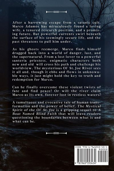 After a harrowing escape from a satanic cult, Marco Adamos has miraculously found a loving wife, a tenured research position, and a promising future. But powerful currents swirl beneath the surface of his seemingly secure life, and the past threatens to pull him under. As his ghosts reemerge, Marco finds himself dragged back into a world of danger, lust, and the supernatural. From a lost lover to a powerful santeria priestess, enigmatic characters both new and old will cross his path and challenge his worldview. The mysterious Ol' St. Joe River sees it all and, though it ebbs and flows in unknowable ways, it just might hold the key to truth and redemption for Marco. Can he finally overcome these violent twists of fate and find peace? Or will the river claim Marco as its own, forever lost in restless waters? A tumultuous and evocative tale of human transformation and the power of belief, The Mystical Spirit of the Ol' St. Joe is a gripping sequel to A Boat Named Blind Faith that will leave readers questioning the boundaries between what is and what can be.