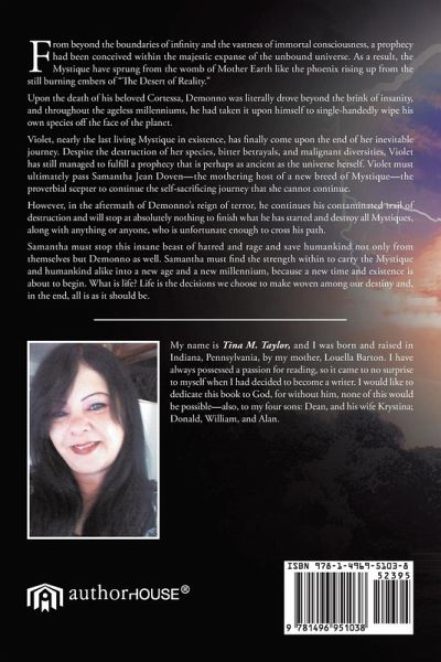 From beyond the boundaries of infinity and the vastness of immortal consciousness, a prophecy had been conceived within the majestic expanse of the unbound universe. As a result, the Mystique have sprung from the womb of Mother Earth like the phoenix rising up from the still burning embers of "The Desert of Reality." Upon the death of his beloved Cortessa, Demonno was literally drove beyond the brink of insanity, and throughout the ageless millenniums, he had taken it upon himself to single-handedly wipe his own species off the face of the planet. Violet, nearly the last living Mystique in existence, has finally come upon the end of her inevitable journey. Despite the destruction of her species, bitter betrayals, and malignant diversities, Violet has still managed to fulfill a prophecy that is perhaps as ancient as the universe herself. Violet must ultimately pass Samantha Jean Doven-the mothering host of a new breed of Mystique-the proverbial scepter to continue the self-sacrificing journey that she cannot continue. However, in the aftermath of Demonno's reign of terror, he continues his contaminated trail of destruction and will stop at absolutely nothing to finish what he has started and destroy all Mystiques, along with anything or anyone, who is unfortunate enough to cross his path. Samantha must stop this insane beast of hatred and rage and save humankind not only from themselves but Demonno as well. Samantha must find the strength within to carry the Mystique and humankind alike into a new age and a new millennium, because a new time and existence is about to begin. What is life? Life is the decisions we choose to make woven among our destiny and, in the end, all is as it should be.