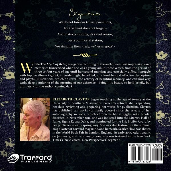 While The Myth of Being is a gentle recording of the author's earliest impressions and memories transcribed when she was a young adult, these verses, from the period of three or four years of age until her second marriage and especially difficult struggle with bipolar illness (1970s), an aside might be added; at a level beyond effective description and playful illustrations, which do reveal the activity of beautiful memory, one can find very early, deep pondering of the meaning of our existence-being-its beauty to hold briefly, but ultimately for the author, coming dark.