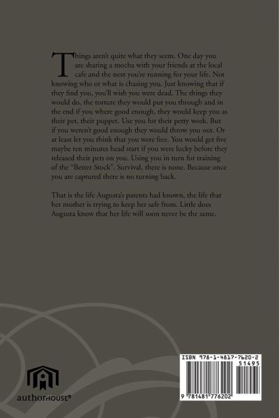 Things aren't quite what they seem. One day you are sharing a mocha with your friends at the local cafe and the next you're running for your life. Not knowing who or what is chasing you. Just knowing that if they find you, you'll wish you were dead. The things they would do, the torture they would put you threw and in the end if you where good enough, they would keep you as their pet, their puppet. Use you for their petty work. But if you weren't good enough they would throw you out. Or at least let you think that you were free. You would get five maybe ten minutes head start if you were lucky before they released their pets on you. Using you in turn for training of the "Better Stock". Survival, there is none. Because once you are captured there is no turning back. That is the life Augusta's parents had known, the life that her mother is trying to keep her safe from. Little does Augusta know that her life will soon never be the same.