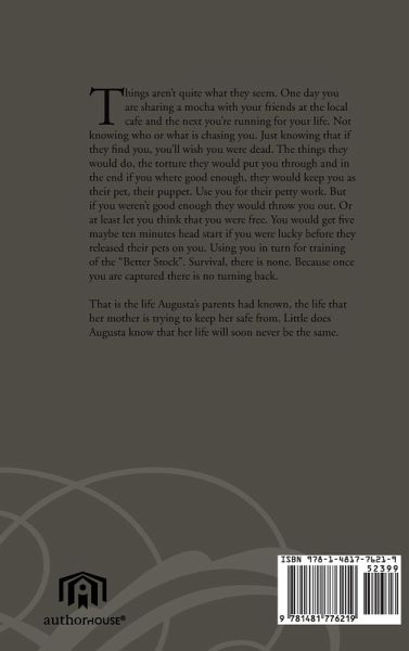 Things aren't quite what they seem. One day you are sharing a mocha with your friends at the local cafe and the next you're running for your life. Not knowing who or what is chasing you. Just knowing that if they find you, you'll wish you were dead. The things they would do, the torture they would put you threw and in the end if you where good enough, they would keep you as their pet, their puppet. Use you for their petty work. But if you weren't good enough they would throw you out. Or at least let you think that you were free. You would get five maybe ten minutes head start if you were lucky before they released their pets on you. Using you in turn for training of the "Better Stock". Survival, there is none. Because once you are captured there is no turning back. That is the life Augusta's parents had known, the life that her mother is trying to keep her safe from. Little does Augusta know that her life will soon never be the same.